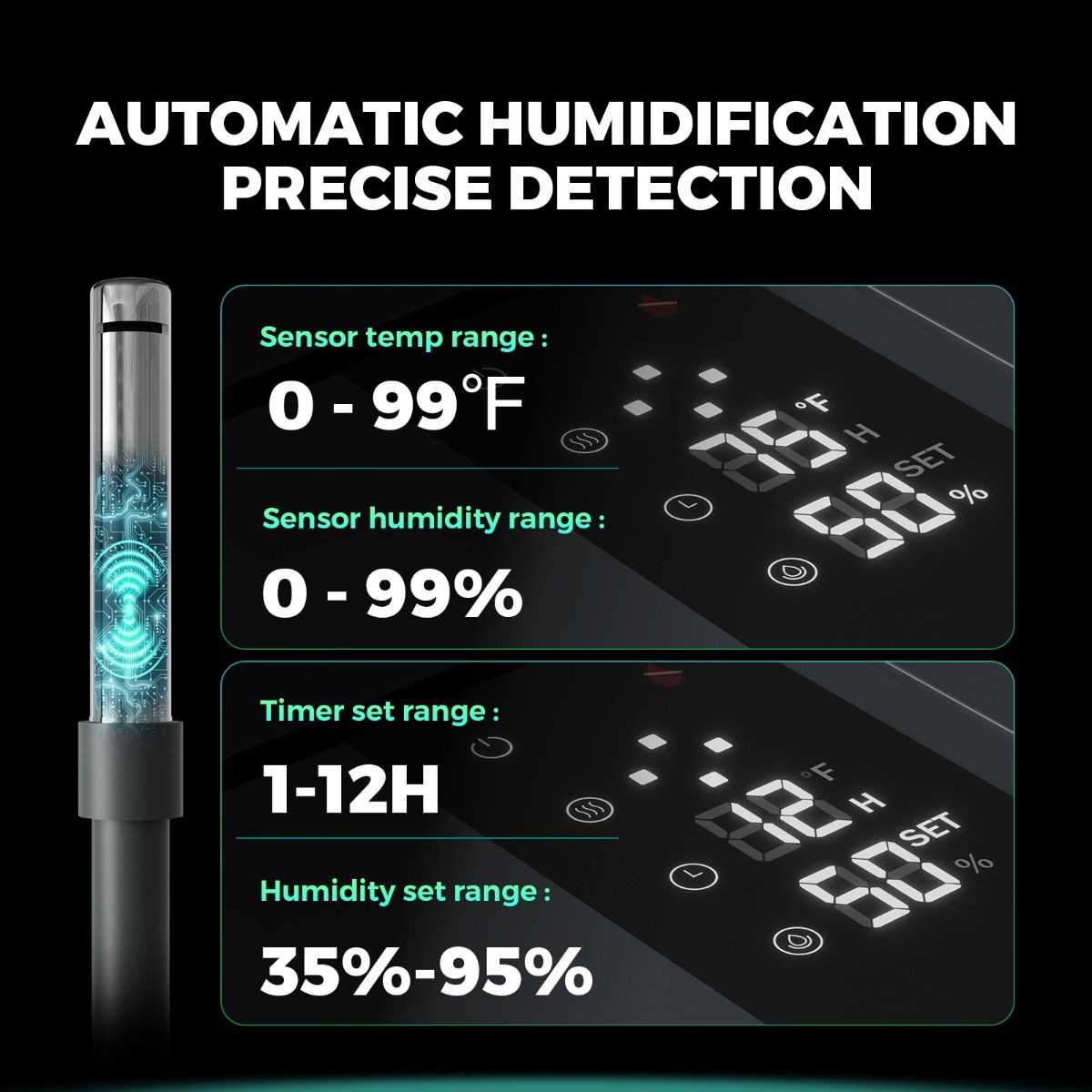 Maintain optimal humidity from 35% to 95% with built-in sensors that automatically adjust mist output. Real-time temperature display keeps you informed, ensuring stable and ideal growing conditions.