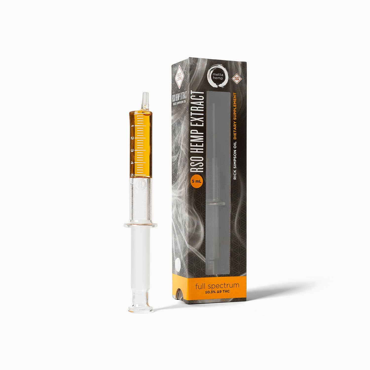 This is a high-CBD Rick Simpson Oil (RSO) extract containing 5 grams of full-spectrum hemp oil with less than 0.3% THC, designed to provide therapeutic benefits without psychoactive effects. The company donates $1 from each syringe sold to Rick Simpson’s recovery fund and markets the product for pain relief, sleep support, and general wellness applications.